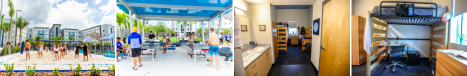 MGアカデミーにはアセンダーホールと呼ばれるスタイリッシュな学生寮が3棟あり、建物の前にはプールと屋外バスケットボールコート、そしてサッカーなどができる人工芝スペースが併設されています。各部屋には2段ベッドが2つとバスルーム・シャワーが備わっており、一人ずつロッカーと鍵のかかるセーフティボックスが与えられます。各部屋には年齢別で合計4名までが共有(長期の学生は通常2人で共有)。各フロアにはランドリールームがあり、洗濯機・乾燥機が複数台提供されています。また各棟の1階には寮スタッフが複数常駐し、共有スペースにはソファやテレビ・自動販売機・卓球台なども設置。入口には寮のスタッフとは別にセキュリティスタッフが24時間常駐しており、セキュリティカメラは寮内のいたるところに配備されています。