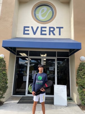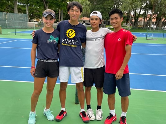 現地では、インターナショナルスクールに通いながら、世界中の仲間たちと共通言語の「英語」を用いて、共通の「テニス」というスポーツを通じて切磋琢磨することができました。ただ、渡米して数ヶ月で「胸郭出口症候群」という傷病に見舞われ、全力でラケットを振ることができなくなり、「もう帰国したい」と弱音を吐いたこともありました。そのような状況に陥ったためテニススキルの向上は不十分だったものの、英語だけで過ごす寮・学校生活も持ち前の明るさと社交力で英語力不足を補い、信頼できるエヴァートのコーチや友だちに囲まれて、充実した1年を過ごすことができたようです。帰国前には、「もっと居たかった」と名残惜しかったようですが、約束事でしたし、家庭の事情(母の入院や資金面など)もあり留学は継続させてあげられませんでした。